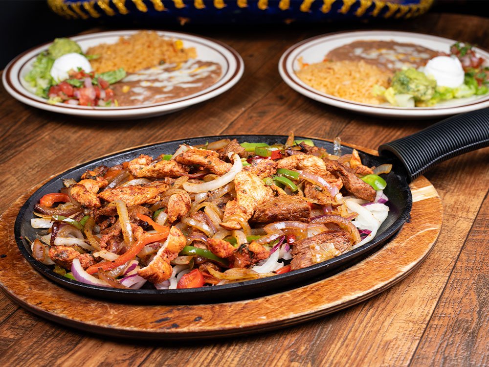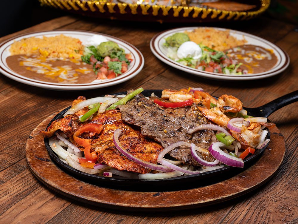 One or two of the following: Steak, Chicken or Shrimp. Served on a bed of onion, red and green bell pepper. Served with two side plates of rice, beans, garnished with pico de gallo, sour cream and guacamole.
