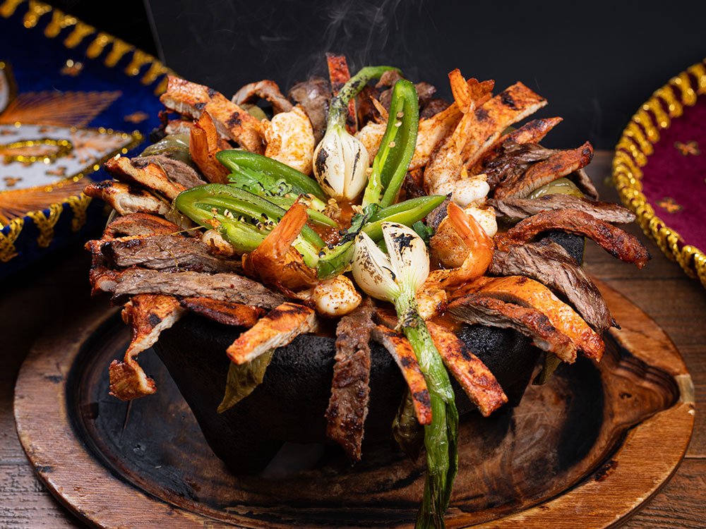 Chorizo, skirt steak strips, grilled chicken strips, shrimp, pork strips, grilled cactus, Monterey cheese and homemade molcajete sauce. Served with two sides of rice, beans, garnished with pico de gallo, guacamole and sour cream.