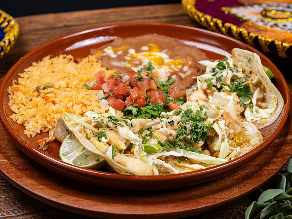 Three corn tortillas with grilled fish, garnished in a creamy jalapeño baja coleslaw and cilantro. Served with rice and beans.