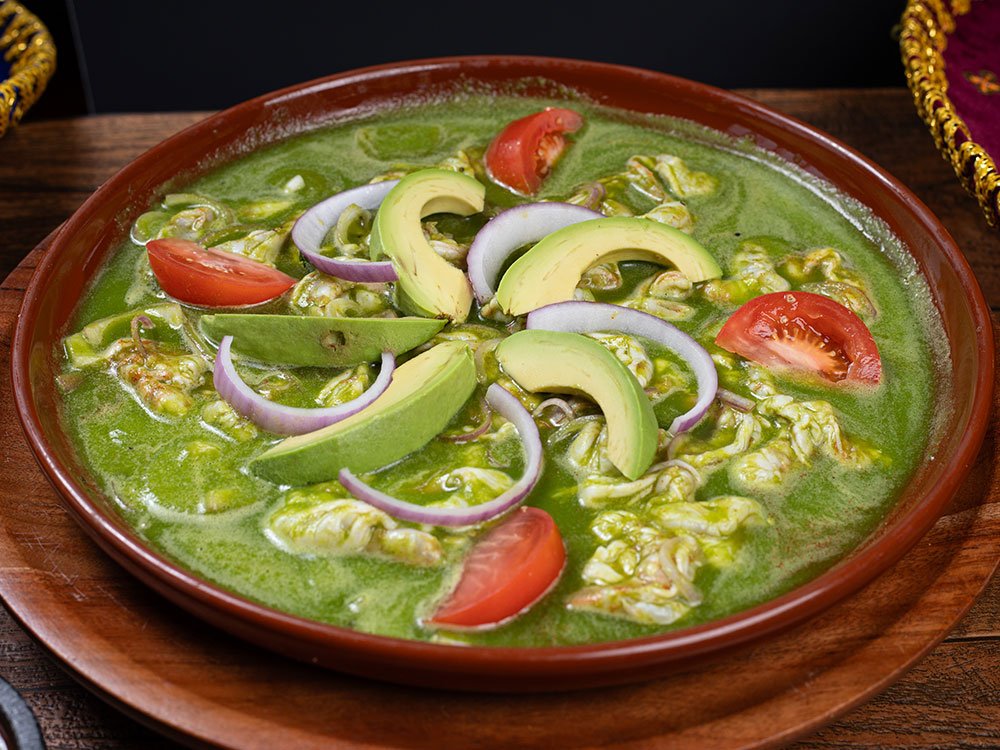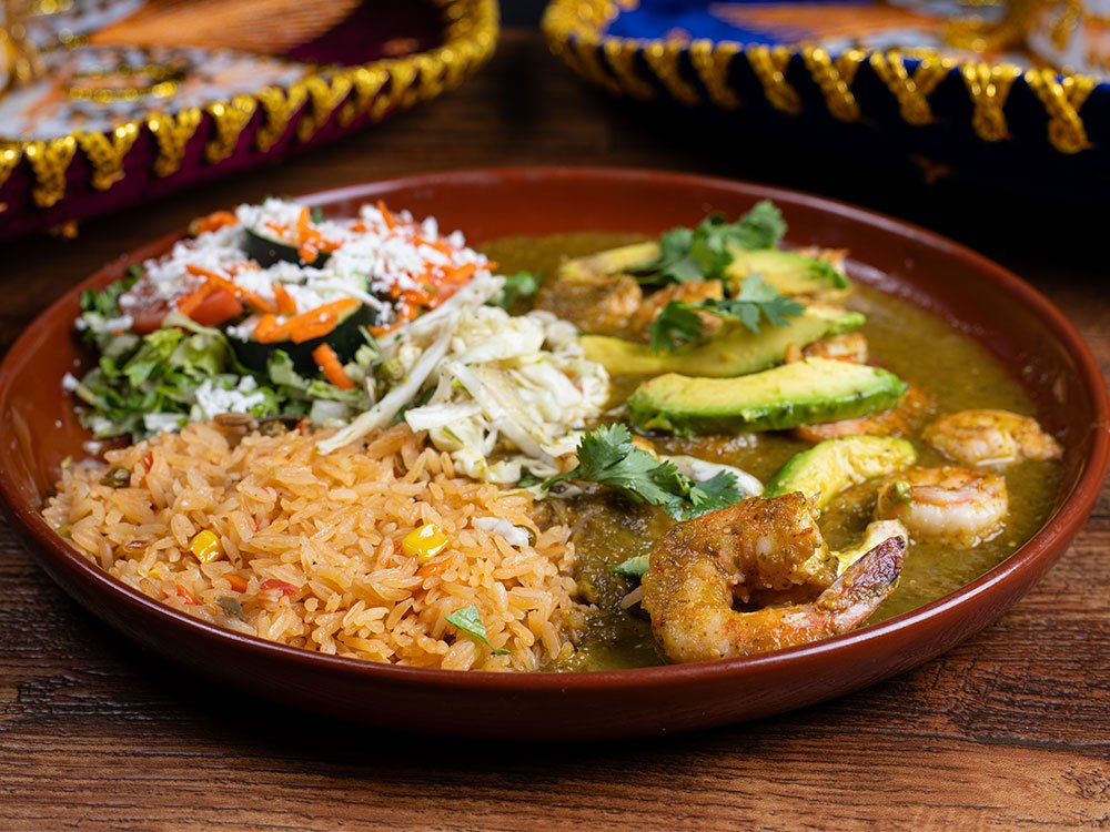 Shrimp sautéed and simmered in our green tomatillo sauce garnished with cilantro and avocado slices. Served with rice and salad.