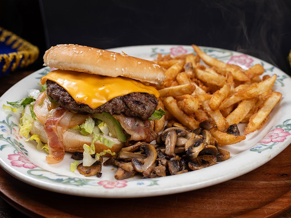 Beef patty with bacon, American cheese, avocado, lettuce and tomato. Served with sautéed mushrooms and French fries.