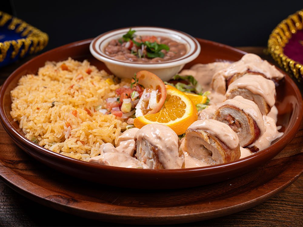 Chicken breast filled with shrimp and pico de gallo then rolled and wrapped in bacon, covered in a creamy sauce with mushrooms. Served with rice, whole beans, garnished with pico de gallo, lettuce, tomato and orange.