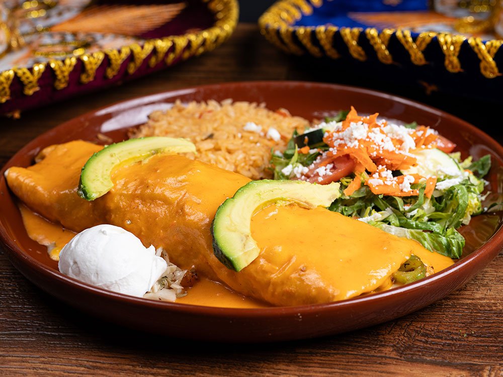 Sautéed shrimp, octopus, scallops, fish, onion, red and green bell pepper inside, topped with seafood sauce. Served with rice, salad, avocado and sour cream.