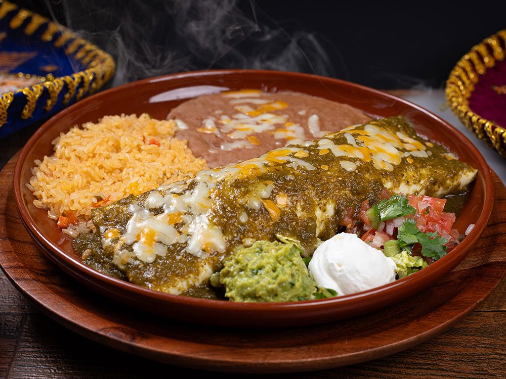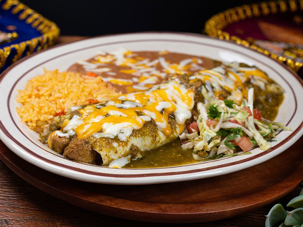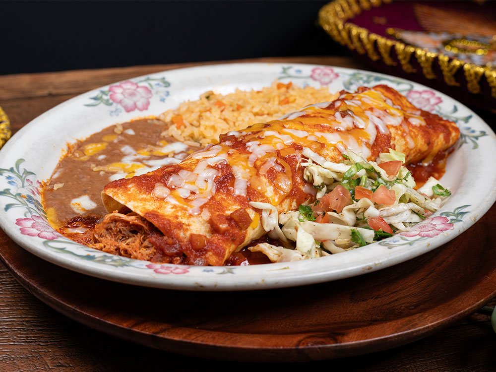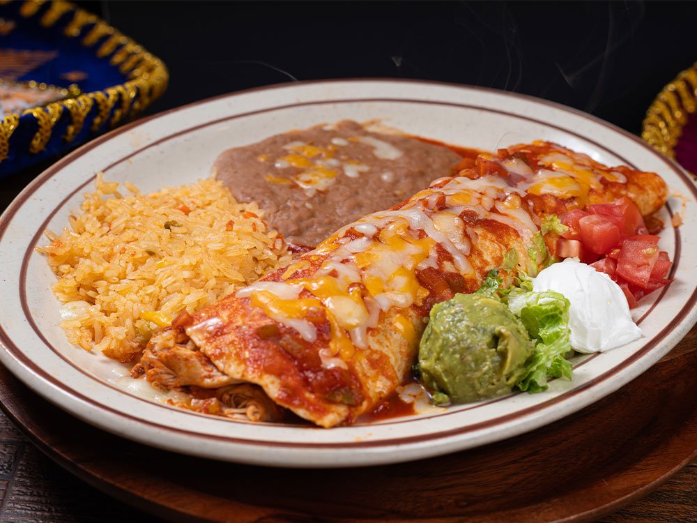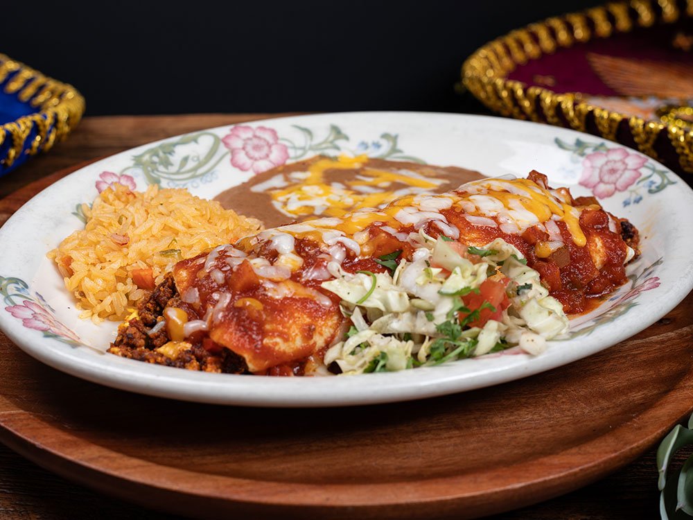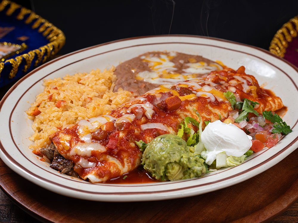 Shredded beef, shredded chicken or ground beef with rice, beans and cheese inside, topped with red sauce. Served with guacamole, sour cream and tomato.