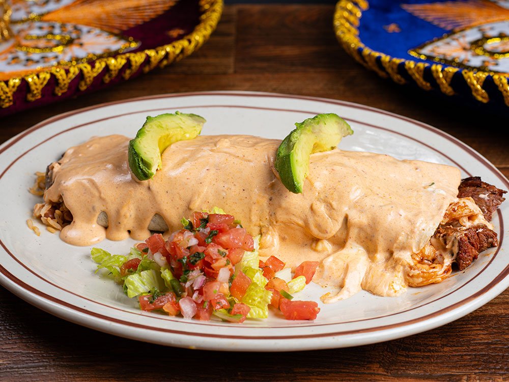Aka Surf & Turf with steak and shrimp, whole beans and rice inside, topped with chipotle sauce. Served with avocado and pico de gallo.