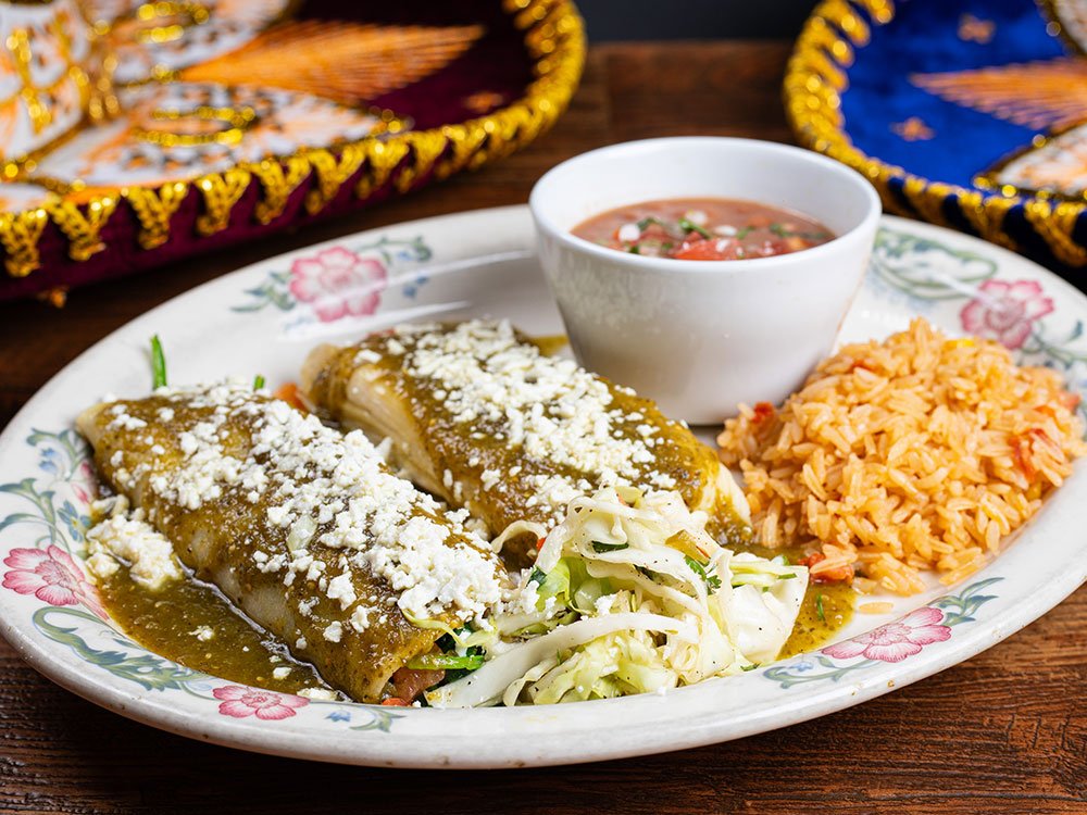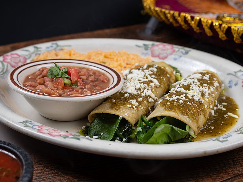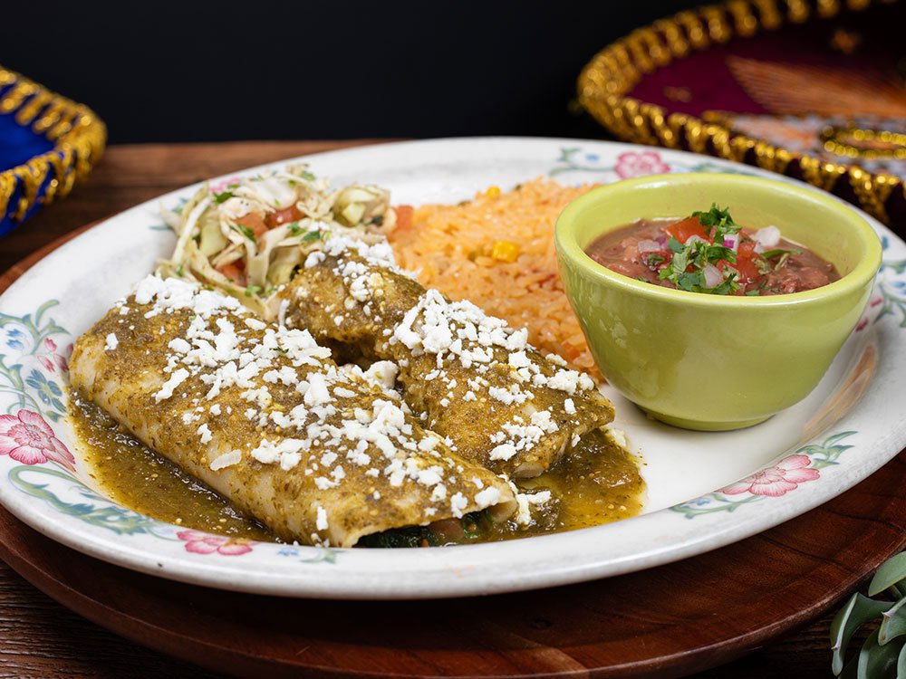 Two corn enchiladas with spinach, pico de gallo, topped with green tomatillo sauce and queso fresco. Served with whole beans and rice, garnished with coleslaw.