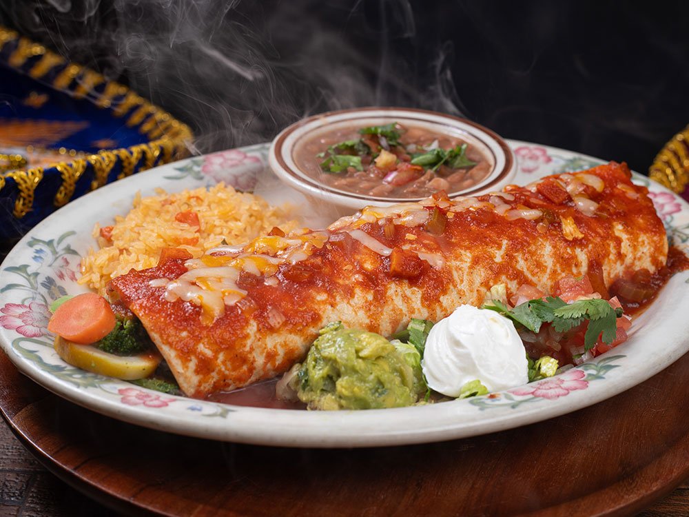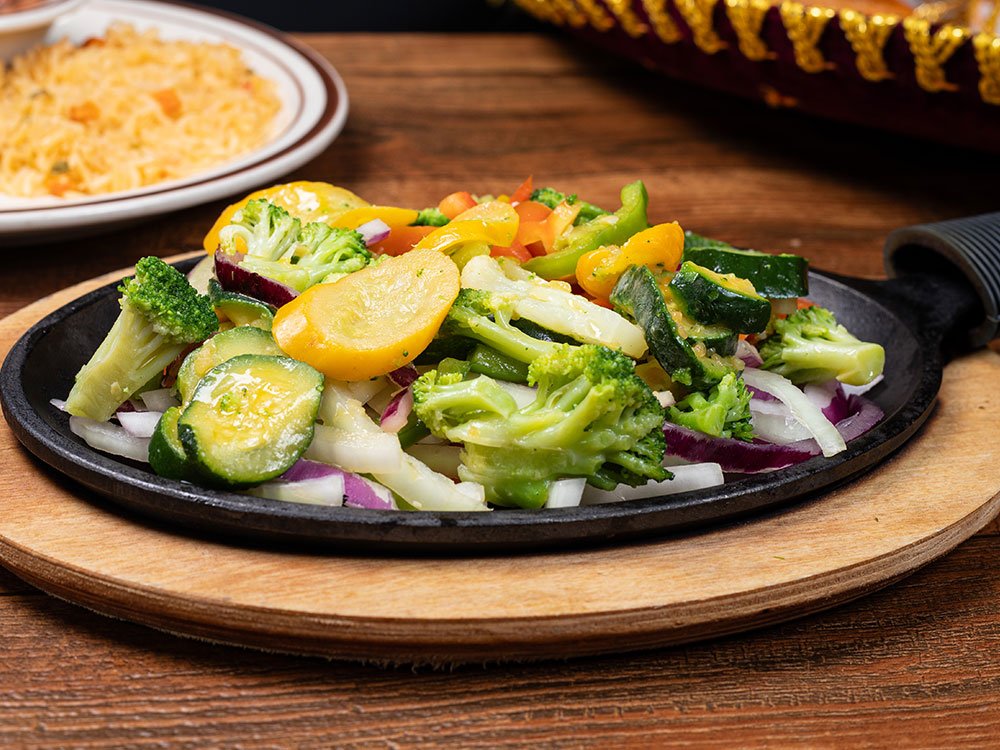 Sautéed zucchinni, coliflower, brocoli, mushroom, carrots, red and green, bell pepper and onion, topped with burrito sauce and melted cheese. Served with whole beans, ric, lettuce, tomato, guacamole and sour cream.