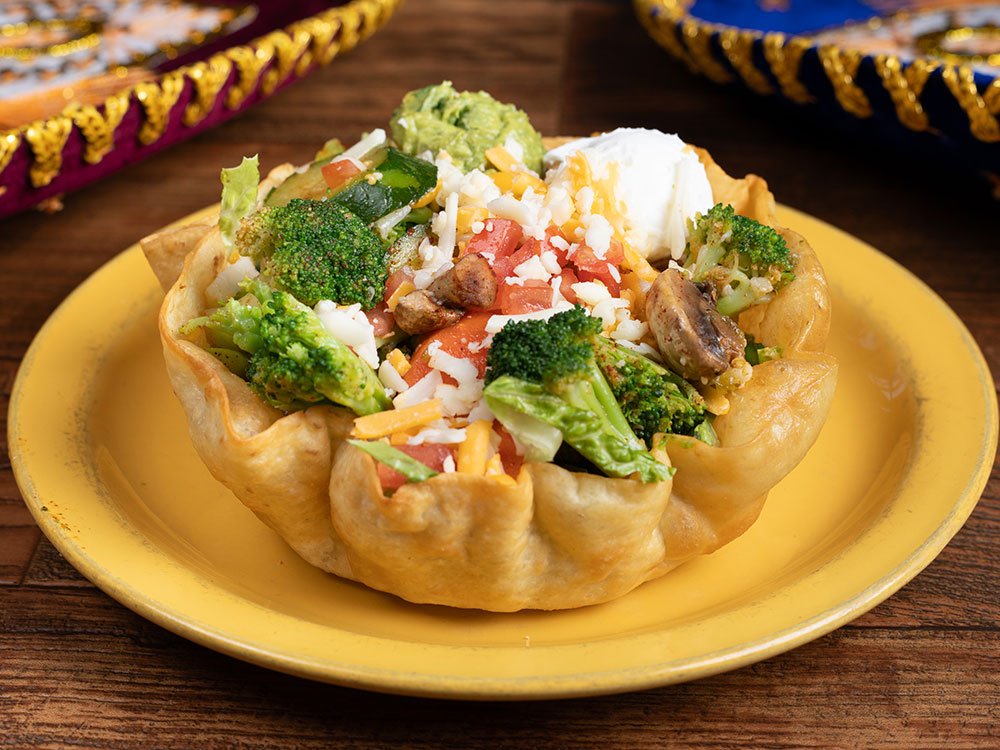 Flour totilla bowl. grilled seasonal veggies, topped with lettuce, tomato, chesse, sour cream and guacamole.